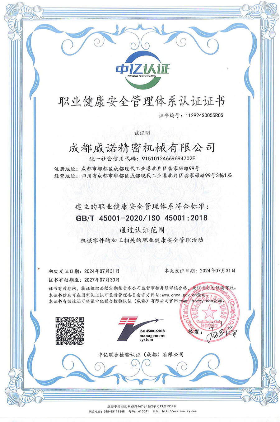 職業健康安全管理體係認證證書